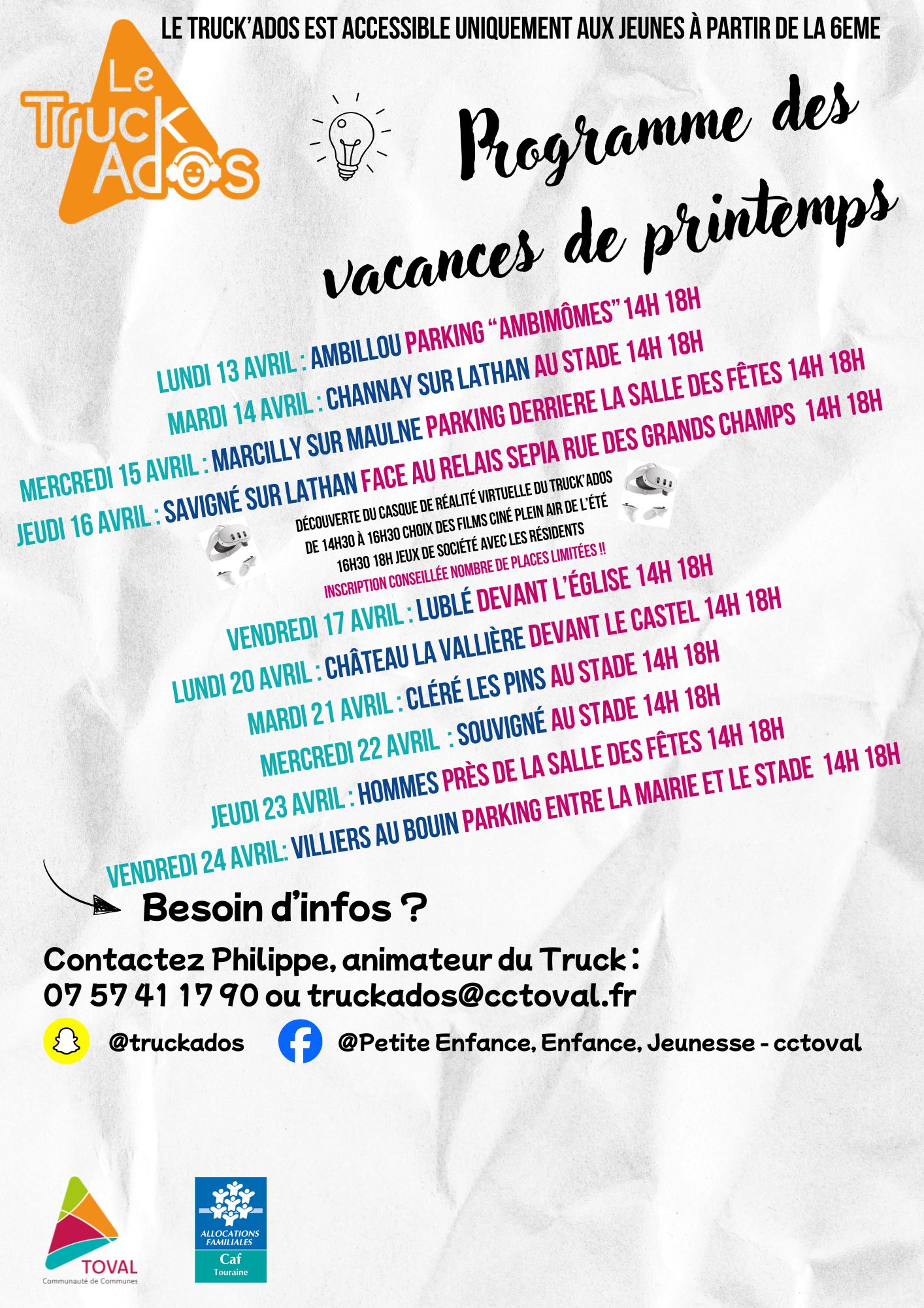 Le Truck Ados sera présent à Château la Vallière le lundi 20 avril devant le Castel de 14h à 18h